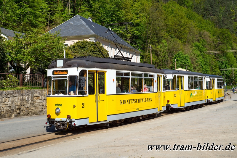 Nach ihrer Umrüstung für den Einsatz auf der Kirnitzschtalbahn kommen sie mit der Nummer 1 (ex Plauen 61) und 2 (ex Plauen 63)